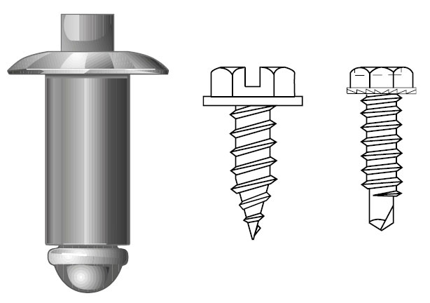 Från vänster: Trycktät blindnit; penetrerande och gängpressand skruv; skruv med reducerad borrspets (så kallad sotarskruv).